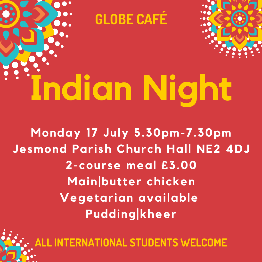Join us for an enchanting Indian Night event! Dress in vibrant colours, learn some Indian culture and try delicious traditional Indian cuisine 2-course dinner, only £3.00 per person. See you there for an unforgettable evening! ?